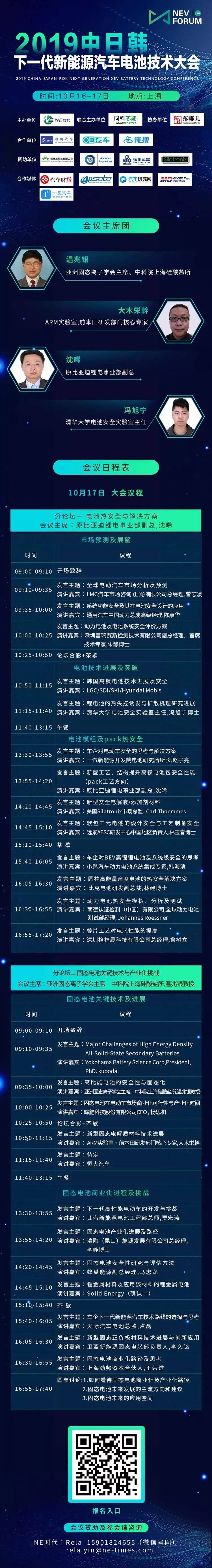 >10月16-17日“2019中日韩下一代新能源汽车电池技术大会”将于嘉定汽车城瑞立大酒店隆重召开,会议>将主要围绕新能源汽车动力电池前瞻技术,从国家最新政策、国内外动力电池市场发展及预测、国际主流整车及电池产业链上下游企业的技术发展、市场布局诸多维度,来探讨电池热安全关键技术及系统解决方案、电动汽车下一代电池的技术趋势以及商业化的可行性。在此,广邀行业朋友的探讨与参与。> >