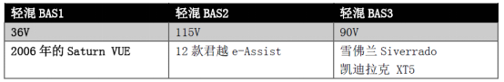 而在美国,通用从2006年开始研究轻混系统,命名为BAS系统,是Battery Assist System的缩写,通用汽车的该套系统经历了前后三代的变化,最新一代系统最终选择了90V作为轻混系统的电压标准。