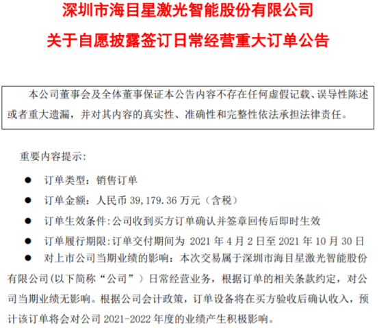 02海目星获宁德时代子公司锂电池高速激光制片机订单——3.92亿元>