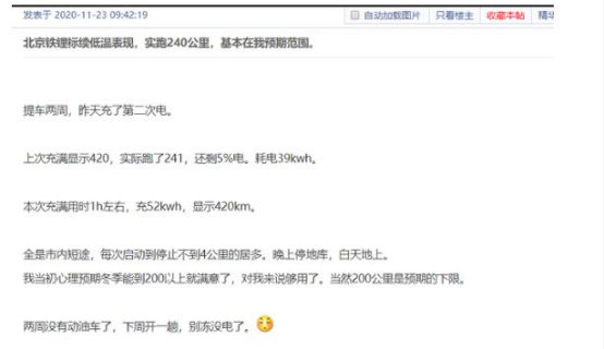 >“虽然符合预期,与官方宣称的468km续航差别不小。实际在200km以上的续航,算是我的预期下限。”该车主表示。与他有相同遭遇的车主不少。>