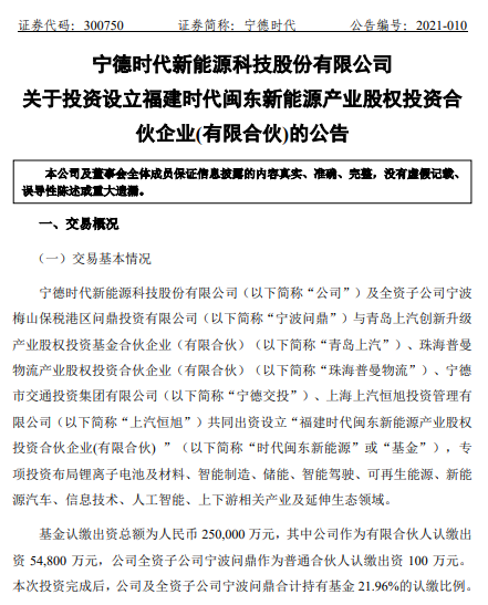 > >基金认缴出资总额为人民币25亿元,其中宁德时代作为有限合伙人认缴出资5.48亿元,宁德时代全资子公司宁波问鼎作为普通合伙人认缴出资100万元。本次投资完成后,宁德时代及全资子公司宁波问鼎合计持有基金21.96%的认缴比例。>
