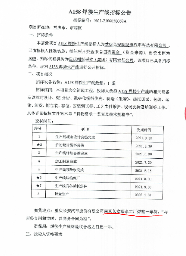 根据公告,项目A158焊接生产线招标人为重庆长安新能源汽车科技有限公司,生产线数量1条。交货地点为重庆长安汽车有限公司南京长安溧水工厂焊接一车间。从2021年3月30日生产线概念设计会签完成到2021年9月30日生产线具备试制条件,再到2022年4月30日长安新能源开始批量生产,前后历时一年零一个月。>
