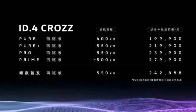 >>近日有消息称,一汽大众ID.4 CROZZ将于3月20日正式上市交付。该车型在1月19日发布了正式售价,共有4个常规配置版本,综合补贴后售价区间为19.99万至27.99万元,而特别的曜夜首发版正式售价为242888元> >。> >