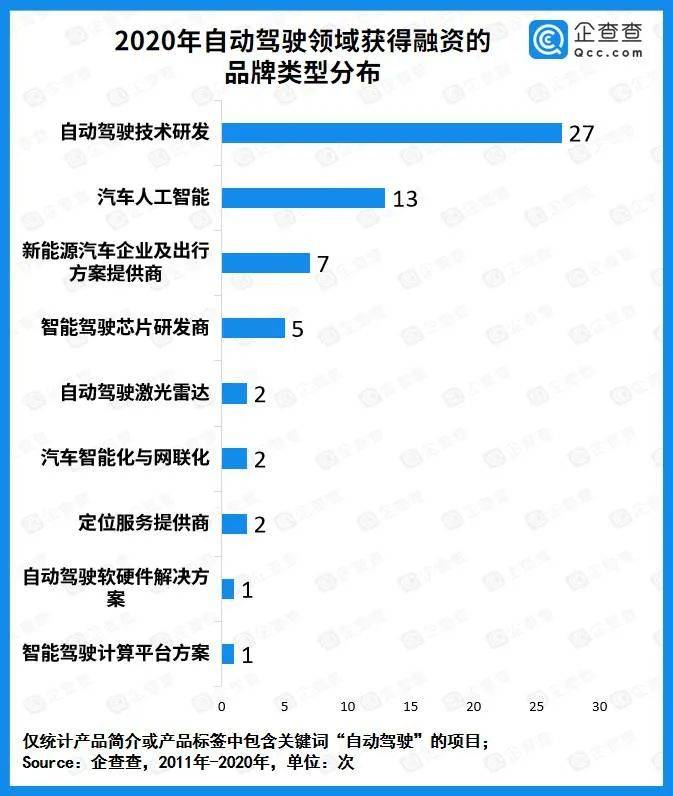 从2020年获得投融资的自动驾驶项目类型看,自动驾驶技术研发、汽车人工智能、新能源汽车及出行方案提供商、智能驾驶芯片研发商、自动驾驶激光雷达是融资最高的品牌类型。>