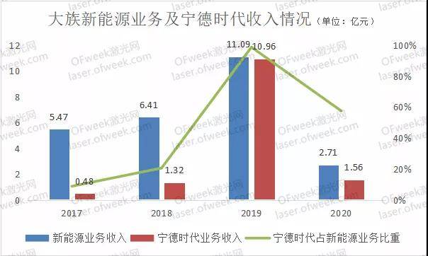 2020年9月18日起,大族激光陆续获得宁德时代及其控股子公司的锂电池生产设备订单,总计金额为11.94亿元人民币,其中已签署正式订单合同的中标设备金额为9.50亿元,尚未签署正式订单合同的中标设备金额为2.44亿元。2020年,大族激光对宁德时代销售收入为1.56亿元,占当年新能源业务总营收的57.56%。截至2020年12月31日, 大族激光与宁德时代合作经审计确认的营业收入累计达14.32亿元。