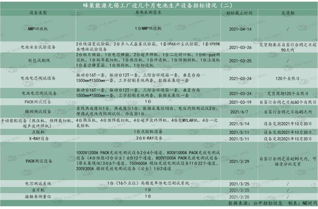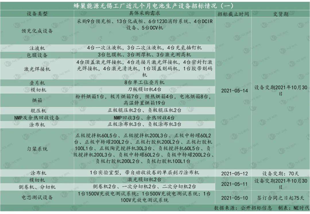 从无锡工厂来看,蜂巢先后准备引进辊压机、叠片机、涂布机、匀浆系统、模切机、分切机、注液机等锂电核心生产设备,而且设备交期集中在2021年10月30日。>