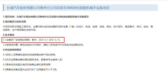 >>招标信息显示,长城汽车准备给泰州工厂引进一套电池包装配机械手设备,要求辅助人员完成HEV车型电池包的装配任务,设备到厂安装调试周期为2021.5.1-2021.5.15。> >