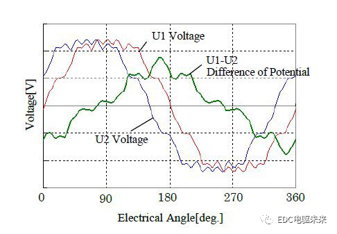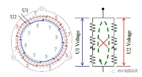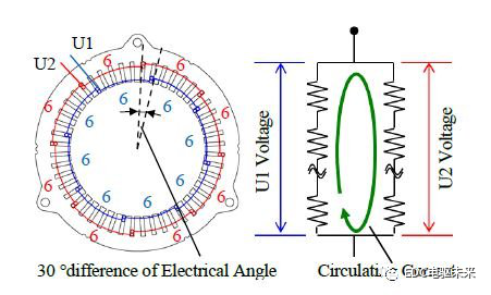 图传统的绕组线连接下由于转子相位差导致的电位差>