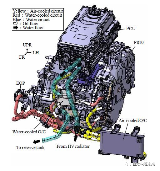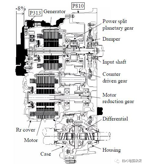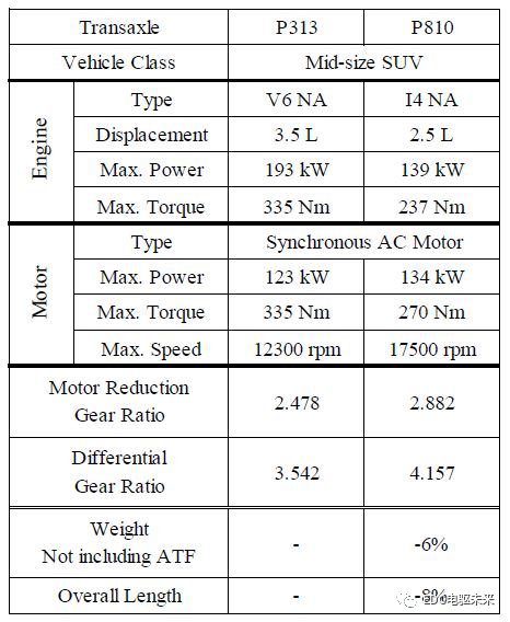传统的HV变速驱动桥(P313)中,发电机与电机为同轴配置,且电机减速机构为行星式,而新型HV变速驱动桥(P810)则与第4代HV系列相同,采取电机与发电机配置于平行轴的结构。驱动电机的减速机构也是采用平行齿轮方式的多轴机构,电机与发电机配置于不同的轴,缩短了变速驱动桥的轴长。此外,采取平行齿轮式后,还扩大了减速比范围,将减速比从2.478扩大至2.882,而电机的最高转速从12300rpm扩大至17500rpm。最大扭矩从335Nm减少至270Nm,实现电机的小型化,同时EV行驶时的输出扭矩提高了10%。>