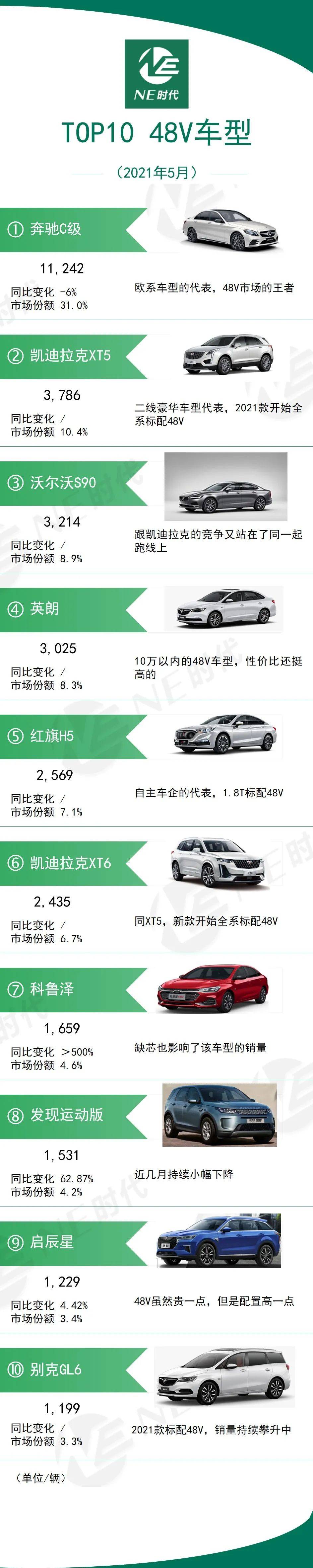 > >此次,NE时代推出了首个48V车型TOP10榜单,而上汽通用旗下的车型占了一半。另外,10款48V车型中,豪华车型也占了50%。可能因为豪华车价格敏感度不高,而且48V系统能提升舒适性能,同时节省部分油耗,基本上是标配。>