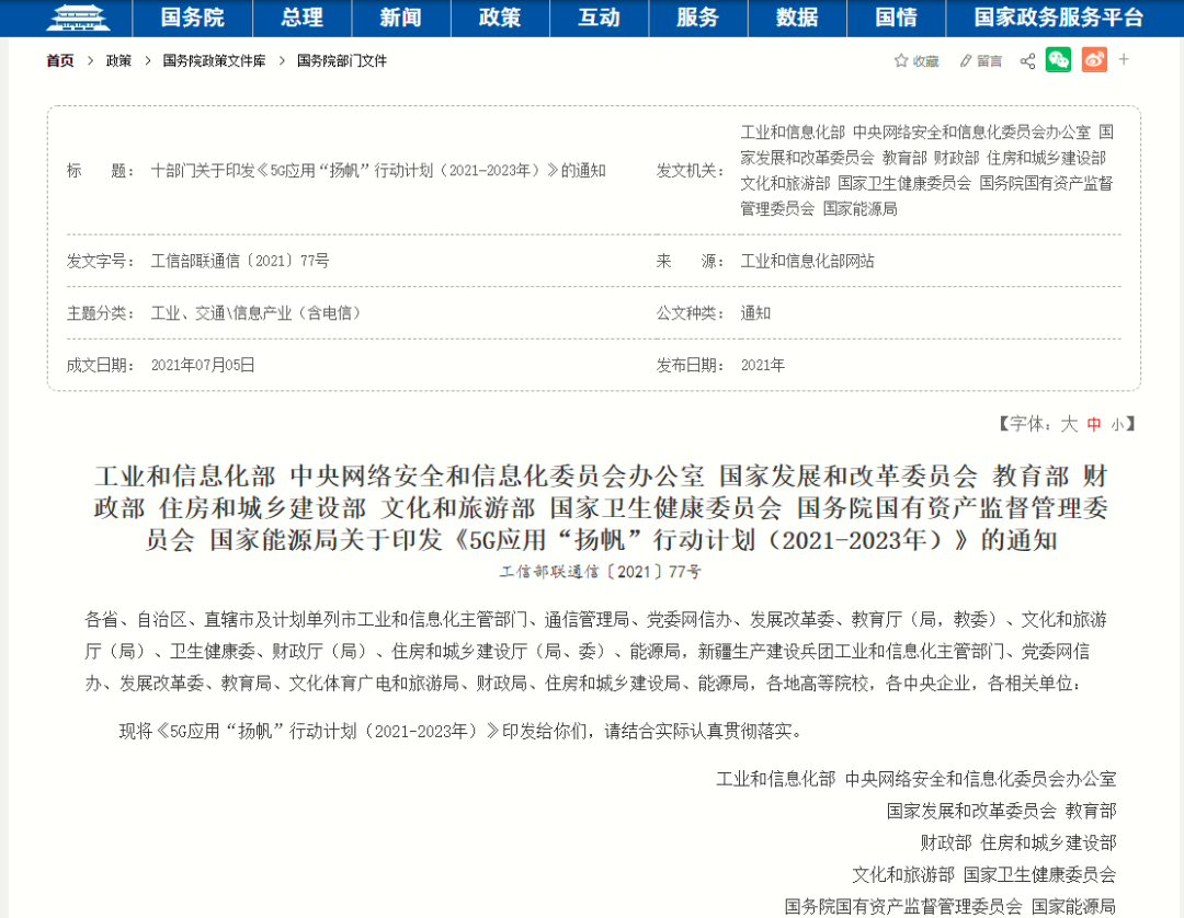 今天《5G应用“扬帆”行动计划(2021-2023年)》发布,发布单位为工信部、中央网信办、国家发改委、教育部、财政部、住建部、文化和旅游部、国家卫健委、国务院国有资产监督管理委员会、国家能源局等十个部门单位。>