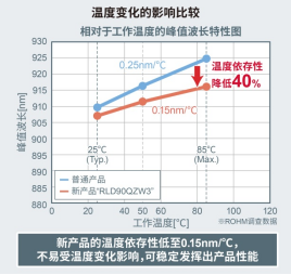 >新产品“RLD90QZW3”利用ROHM激光二极管元器件开发相关的专利技术,作为LiDAR用的75W高输出功率激光二极管,实现了225μm的业界超窄线宽。通过高密度发光实现了高光束性能。此外,除了在整个线宽范围成功地使发光强度更均匀外,激光波长的温度依存性低至0.15nm/℃,不易受温度变化的影响,因此可稳定地发挥其性能。>