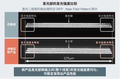 >新产品采用专利技术,在同等输出功率的产品中,不仅实现了业界超窄的线宽,而且,在与线宽存在此消彼长关系的光电转换效率方面,也实现了与普通产品同等的21%的效率(正向电流24A、75W输出时)。因此,在采用时无需担心功耗增加。>