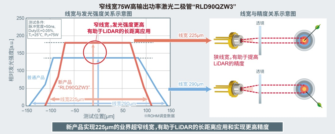 >“RLD90QZW3”是一款红外75W高输出功率激光二极管,针对利用3D ToF系统*3进行测距和空间识别的LiDAR而开发。利用ROHM自有的元器件开发技术,在业界同等输出功率激光二极管中实现了225µm的超窄线宽。与线宽290µm的普通产品相比,线宽缩窄22%,实现了高光束性能。同时,通过使发光强度更均匀,并利用激光波长较低的温度依存性,可稳定发挥高性能,因此有助于LiDAR在各种环境下实现长距离应用和更高精度。此外,与窄线宽存在此消彼长关系的光电转换效率,也达到了与普通产品同等的21%(正向电流24A、75W输出时),因此在采用本产品时无需担心功耗会增加。>