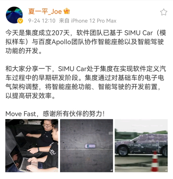 >9月24日,集度CEO夏一平宣布集度成立207天,软件团队已基于 SIMU Car(模拟样车)与百度Apollo团队协作智能座舱以及智能驾驶功能的开发。>