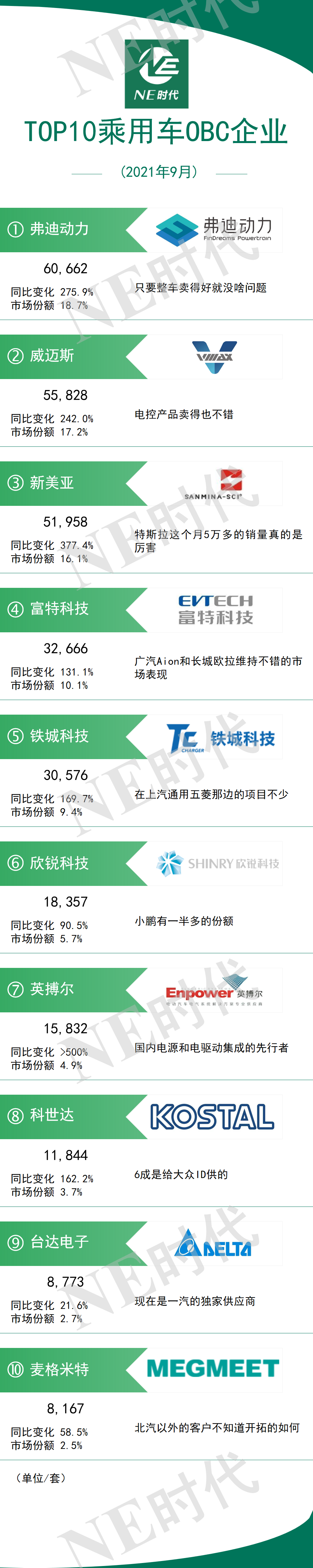 > >从OBC市场来看,9月乘用车装机量为32.4万辆。前十OBC企业装机量累计超90%的份额,而其中前四家企业市场占有率均在10%以上,累计62%。比亚迪随着DMI的上量,9月装机量超6万。特斯拉的供应商新美亚则突破了5万台。威迈斯的小车客户如荣威Clever、长安奔奔、奇瑞小蚂蚁等都取得了不错的销量成立,威迈斯9月装机量接近5.6万。>