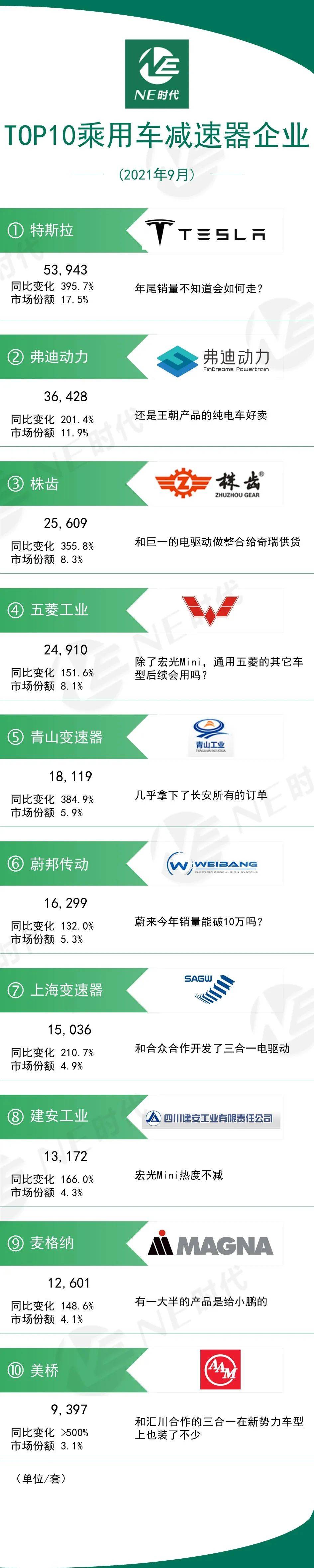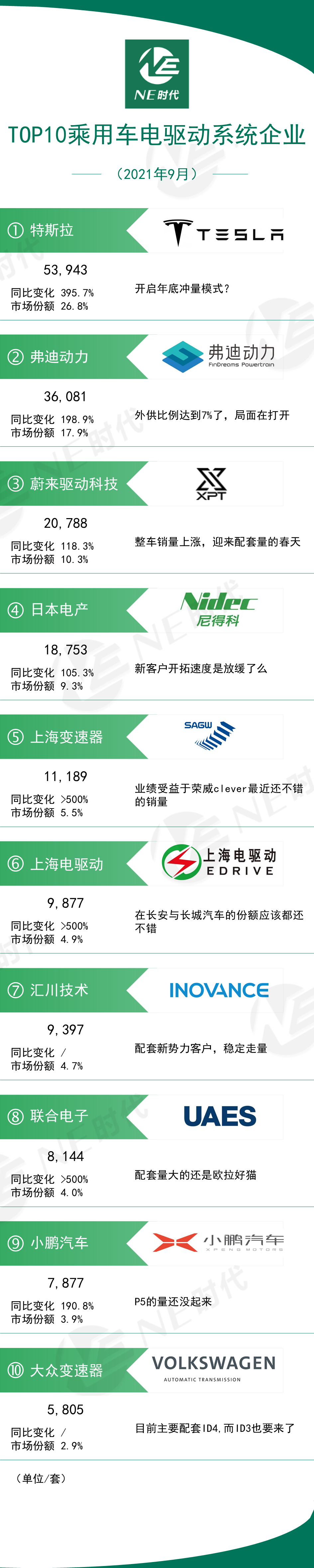> >从三合一及以上的电驱动系统来看,9月装机量突破了20万套,份额占比57%。TOP10中特斯拉、弗迪动力和蔚来驱动科技的三家电驱动企业在三合一产品市场的份额累计达到了55%。>