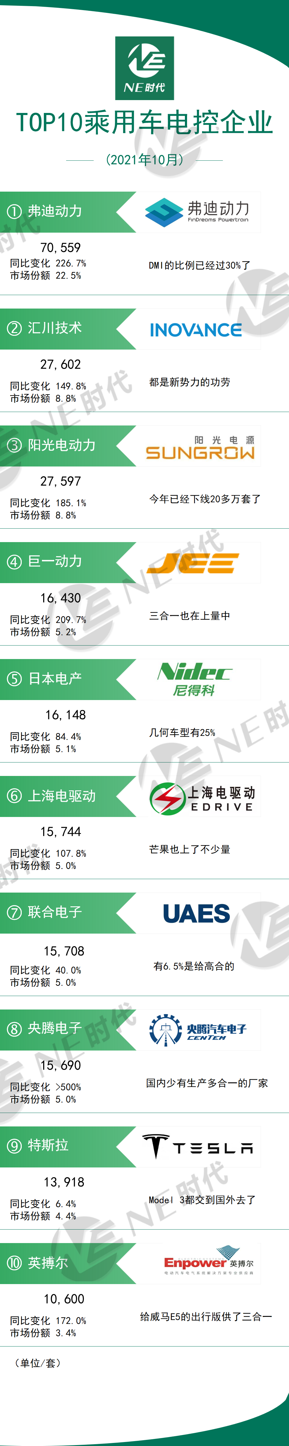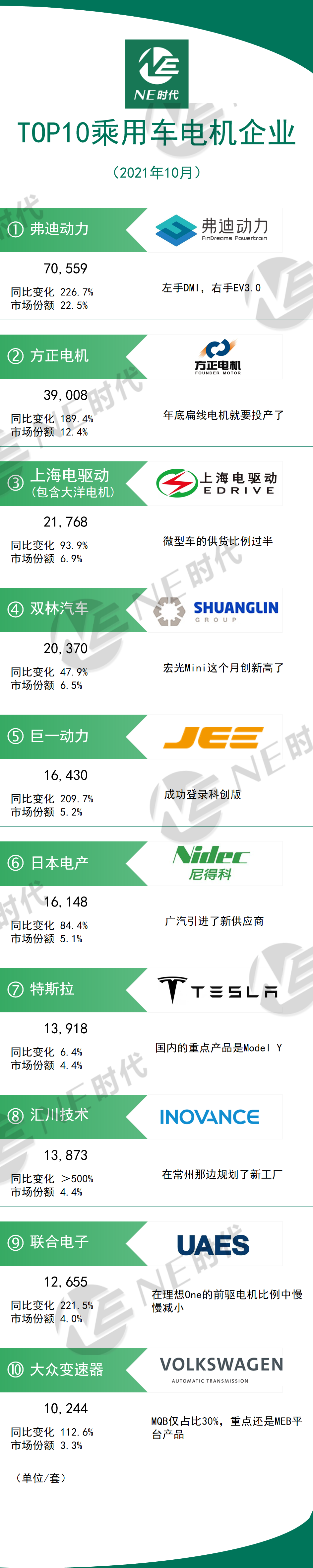 根据保险数据统计,2021年10月,国内新能源乘用车三合一及以上的电驱动系统装机量14.8万套,份额占比47.3%。TOP10中弗迪动力、日本电产和特斯拉三家电驱动企业在三合一产品市场规模在万套以上,份额累计达到了46.8%,其中弗迪动力三合一装机量近4万套。>