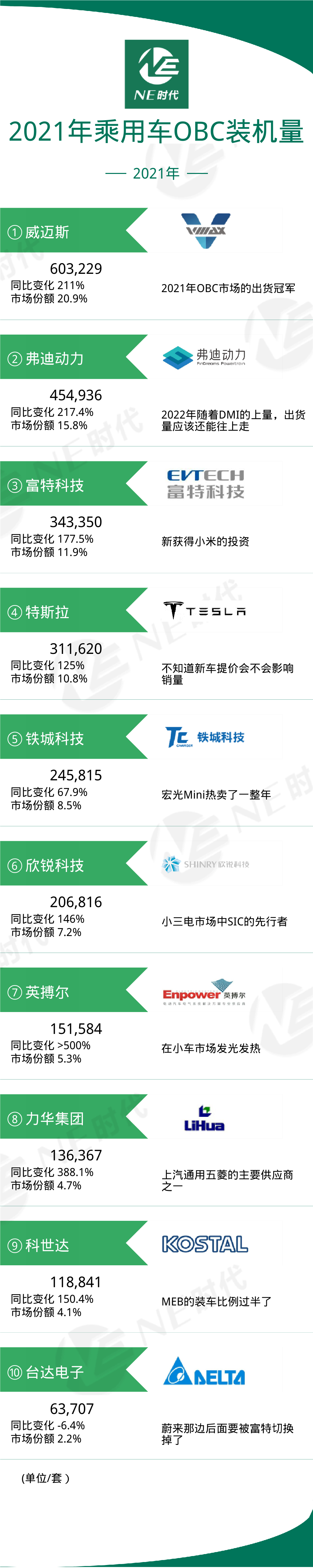 > >从OBC市场来看,2021年乘用车装机量为288.7万套。前十OBC企业装机量累计超90%的份额,而其中前四家企业市场占有率累计59%,均在10%以上。威迈斯2021年装机量超60万,装机量遥遥领先其他企业,其装车量最大的是理想One,另外在小车市场中也有不错的销量表现。弗迪动力装机量超45万,富特和特斯拉分别是34和31万套。>