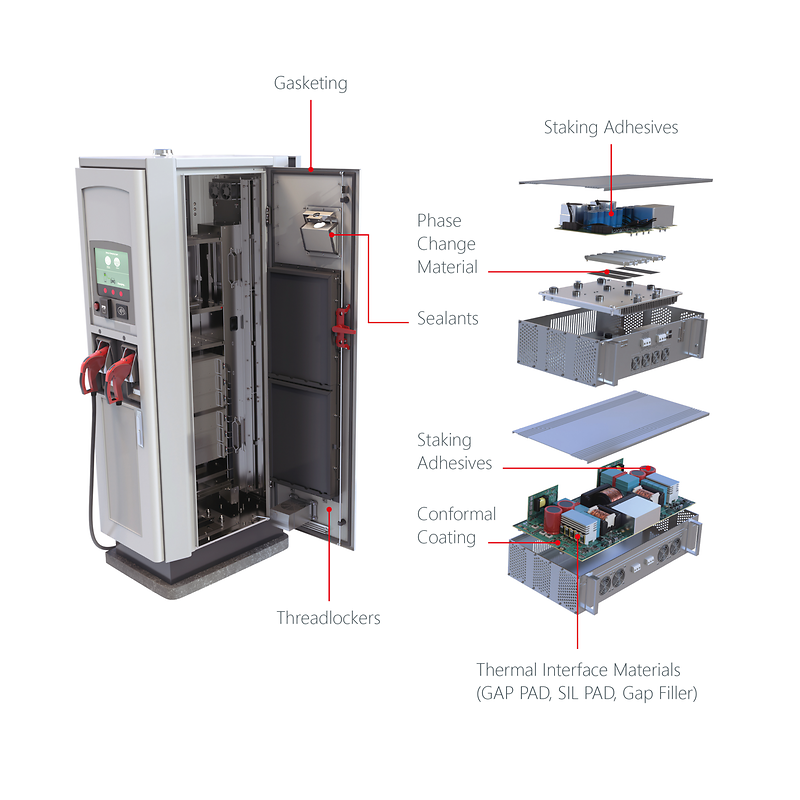 >确保安全可靠运行的导热界面材料——有效散热(无论是220伏还是1000伏产生的热量)可以确保电动汽车充电设备的安全和长期性能。汉高Bergquist®品牌的相变材料、GAP PAD导热垫片和Gap filler液态填隙导热界面材料(TIM),可以确保电动汽车充电器电源模块和高密度组件的稳定运行。> >