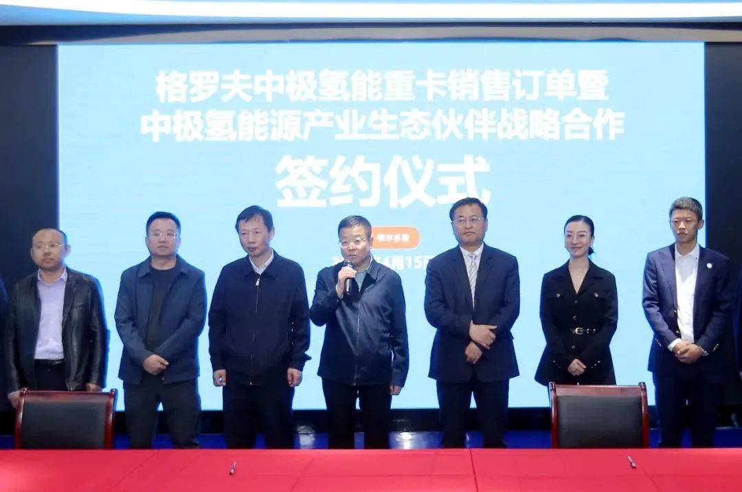 4月15日,中极氢能重卡销售订单暨中极氢能源产业生态伙伴战略合作签约仪式,在鄂尔多斯高新技术产业开发区装备制造产业园“鄂尔多斯·中国氢谷”格罗夫氢能之窗展厅举行。>