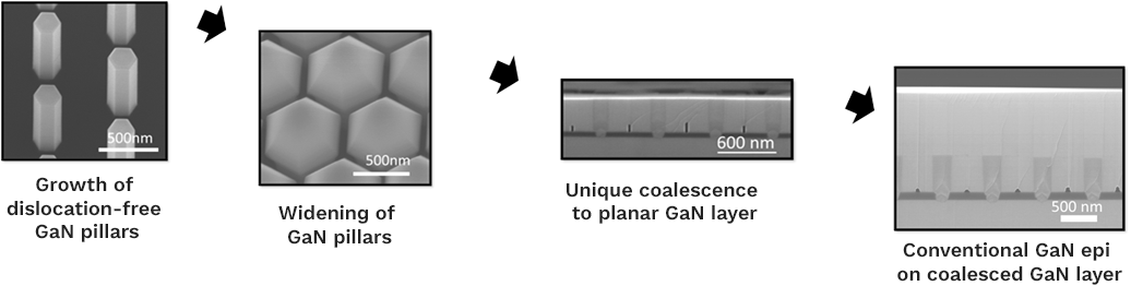 根据该公司文献,>作为该工艺的一部分,氮化硅缓冲层被沉积在硅晶片上,然后用孔阵列对其进行图形化,为无位错 GaN 纳米线的选择性外延生长做好准备。>一旦纳米线生长出来,就会进行侧向外延生长以加宽纳米线,直到它们几乎相互碰撞,形成一个聚结的 GaN 层。>