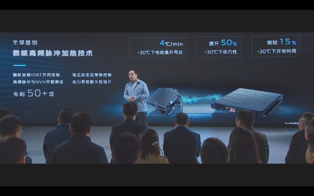 > >目前在超级电驱技术上,长安累计申请的专利数已经达到了163项,其中提出了全球首创的微核高频脉冲加热技术。该技术通过 IGBT 急速地开关产生正负快速切换的大电流,进而借助低温下电池内阻大的特征,将低温环境中的电池快速加热,如电池在零下 30 摄氏度的环境下可以实现每分钟上升 4 摄氏度,带来低温充电时间缩短 15% 和低温环境下动力提升的优点。这套技术在冬天使用时可以进一步减少纯电动车带来的里程焦虑。>