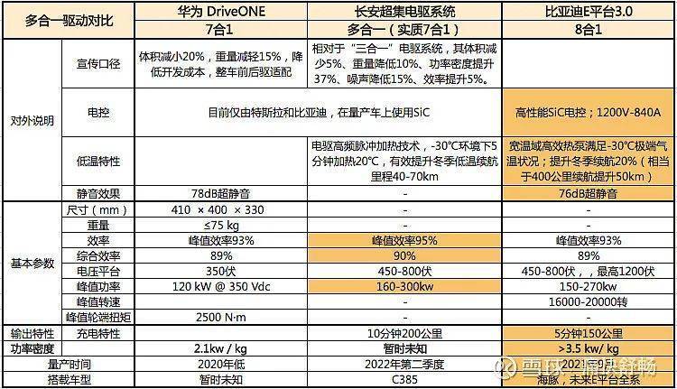 > >七合一和八合一最引人瞩目的系统来自华为和比亚迪。根据两者官方资料,华为七合一的峰值效率为93%,综合效率89%;比亚迪八合一峰值效率93%,综合效率89%。与这两家的多合一相比,长安的七合一在效率上略胜一筹,属于国内的第一梯队。>
