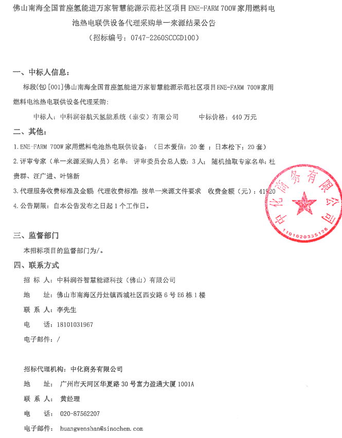 4月25日,中科润谷智慧能源科技(佛山)有限公司发布佛山南海全国首座氢能进万家智慧能源示范社区项目ENE-FARM 700W家用燃料电池热电联供设备代理采购单一来源结果公告。公告显示,中科润谷航天氢能系统(泰安)有限公司,中标价格为440万元。其中,ENE-FARM 700W家用燃料电池热电联供设备来源为日本爱信20套、日本松下20套。公示原文如下所示:>