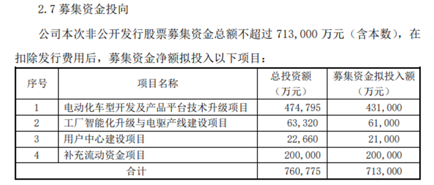 > >据NE时代了解,今年1月26日小康股份推出该定增计划,拟募资不超过71.3亿元,投向“电动化车型开发及产品平台技术升级项目”“工厂智能化升级与电驱产线建设项目”“用户中心建设项目”以及补充流动资金。>