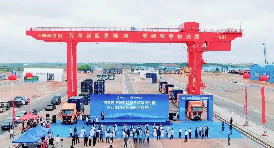 49吨氢能重卡订单交付、商业化示范运营暨产业生态合作伙伴战略合作签约仪式在鄂尔多斯绿动万利新能源智慧陆港举行。>