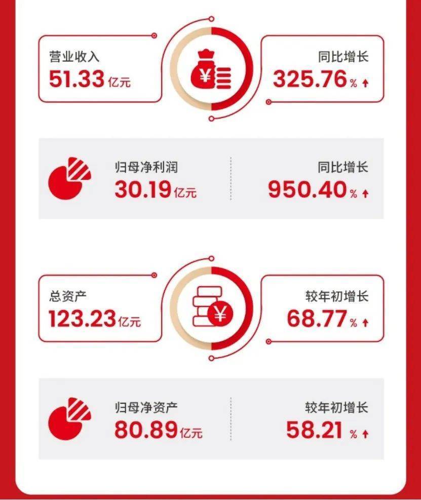 7月26日,盛新锂能披露了2022年半年报。数据显示,盛新锂能上半年实现营业收入51.33亿元,同比增幅325.76%,归属于上市公司股东净利润30.19亿元,同比更是巨增950.4%,基本每股收益3.5元。>
