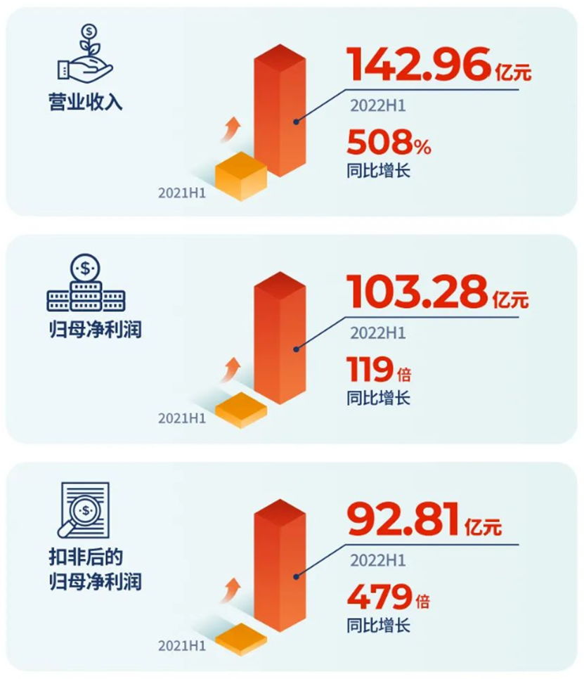 >天齐锂业8月30日公告,2022年上半年公司营收142.96亿元,同比增长508.05%;归母净利润103.28亿元,同比增长11937.16%;扣非归母净利润92.81亿元,同比增长47868.08%。 >