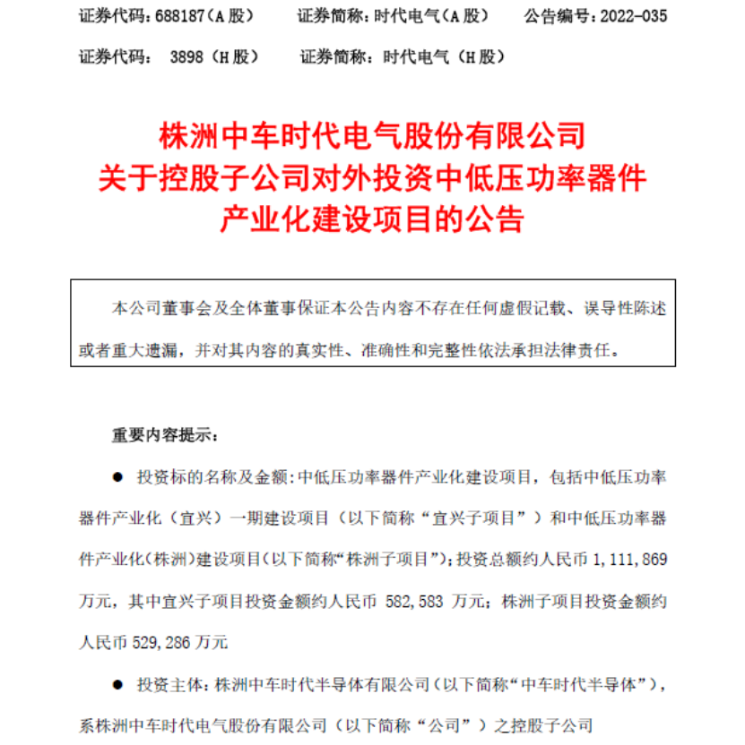 公告披露,株洲中车时代电气股份有限公司(688187)控股子公司中车时代半导体拟投资中低压功率器件产业化建设项目,项目投资总额约人民币1,111,869万元。中低压功率器件产业化建设项目包括中低压功率器件产业化(宜兴)一期建设项目(以下简称“宜兴子项目”)和中低压功率器件产业化(株洲)建设项目(以下简称“株洲子项目”),其中宜兴子项目和株洲子项目投资金额分别约人民币582,583万元和人民币529,286万元。 >