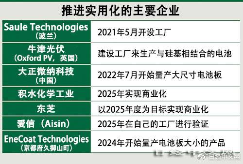 虽然钙钛矿光伏电池是日本开发的技术,但在实用化方面,则是海外企业处于领先水平。2021年5月,波兰初创企业Saule Technologies开设了工厂,此外,中国的大正微纳科技2022年7月开始使用设置在江苏省的年产能为10兆瓦(1兆瓦等于100万瓦)的设备,面向智能手机制造商等量产大尺寸面板。