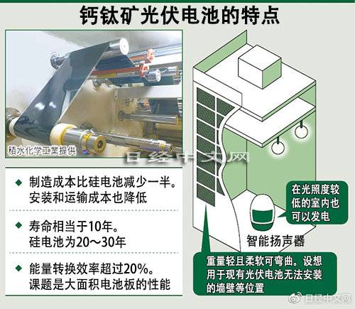 钙钛矿光伏电池是2009年由桐荫横滨大学特任教授宫坂力发明的。这一发明被视为诺贝尔奖的有力候选,有望使用印刷技术,以硅电池的一半成本来制造。重量只有硅电池的十分之一,而且可以弯曲。还有一个优点是可以安装在建筑物的墙壁以及纯电动汽车(EV)的车顶等以前难以设置的地方。