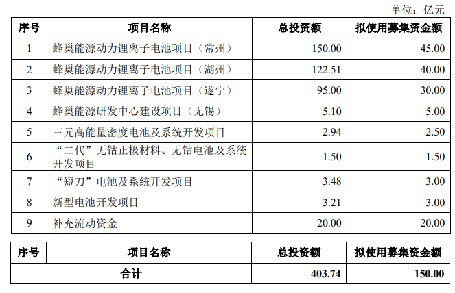 >蜂巢能源此次IPO拟募资150亿元,拟投资项目包括常州、湖州、遂宁的动力锂离子电池项目、无锡研发中心建设项目、三元高能量密度电池及系统开发项目、“二代“无钴正极材料、无钴电池及系统开发项目、”短刀“电池及系统开发项目、新型电池开发项目及补充流动资金。>