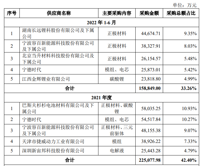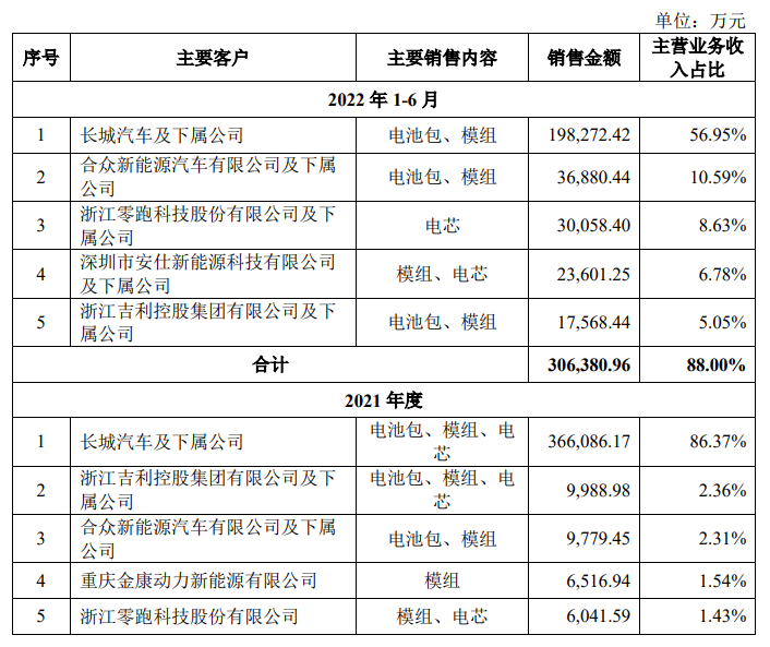 >从2019年到2022年上半年,蜂巢能源前五大客户的实现的主营业务收入合计分别为 8.13亿元、16.69亿元、39.84亿元及 30.64亿元,占主营业务收入比例分别为 100%、99.84%、93.99%及88.00%。>