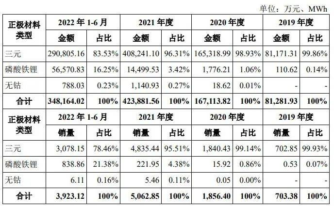 >按照电池材料类型来看,蜂巢能源主要对外销售的是三元材料动力电池系统,占报告期的主营业务收入的比例分别为99.86%、98.93%、96.31%及83.53%,磷酸铁锂动力电池系统收入占比有所提升,从0.14%、1.06%、3.42%到今年上半年的16.25%。无钴电池在今年上半年贡献的收入比例为0.23%。>