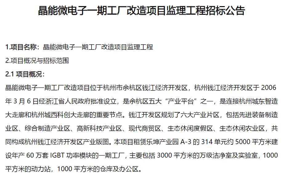 吉利招标平台发布了一则《晶能微电子一期工厂改造项目监理工程招标公告》。该公告指向,吉利加入IGBT封装的自制队伍。