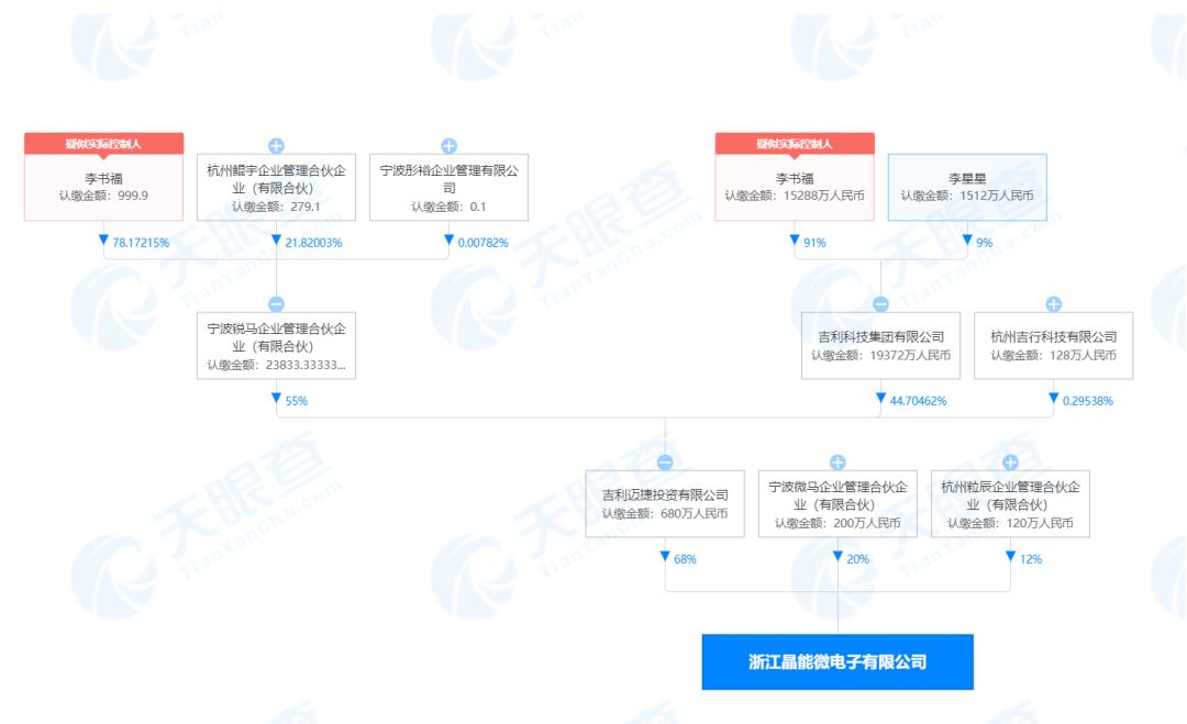 浙江晶能微电子有限公司成立于2022年6月,法定代表人为潘运滨,注册资本1000万元人民币,经营范围包含:半导体分立器件制造;半导体器件专用设备制造;集成电路芯片设计及服务;集成电路芯片及产品制造等。天眼查股权穿透显示,该公司由吉利迈捷投资有限公司、杭州粒辰企业管理合伙企业(有限合伙)、宁波微马企业管理合伙企业(有限合伙)共同持股。