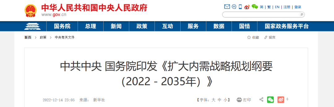 12月14日,中共中央、国务院联合印发了《扩大内需战略规划纲要(2022-2035年)》。>