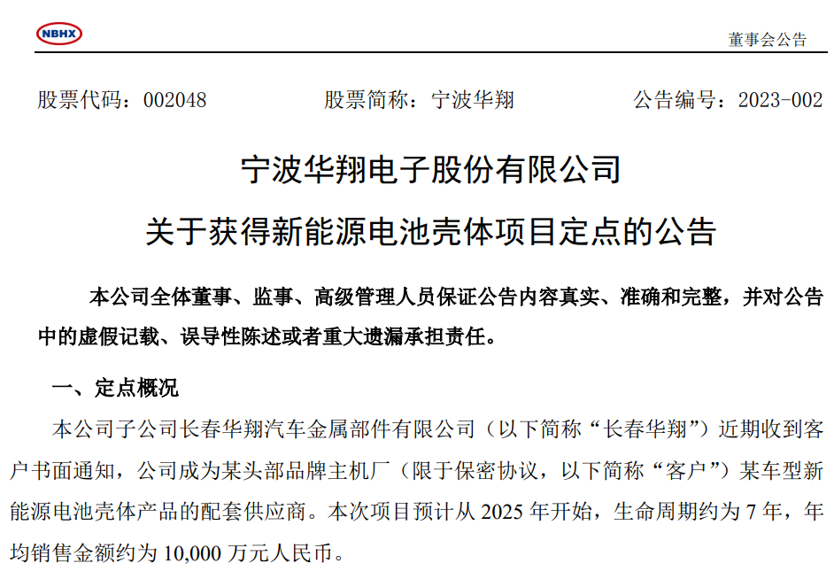 >2月14日,宁波华翔公告,公司子公司长春华翔近期收到客户书面通知,公司成为某头部品牌主机厂某车型新能源电池壳体产品的配套供应商。项目预计从2025年开始,生命周期约7年,年均销售金额约1亿元。> >