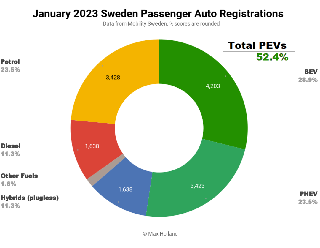 >>1月份的52.4%新能源汽车份额,包括28.9%的纯电动汽车和23.5%的插电式混合动力汽车。相比之下,去年同期的份额分别为52.9%、25.9%、27.0%。因此,BEV仍在稳步取代PHEV。> >