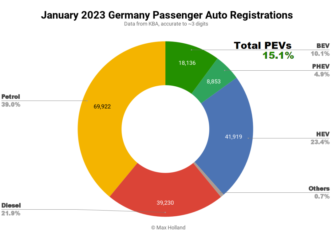 >>BEV的销量同比略有下降,从22年1月的20,892辆下降到本月的18,136辆。从今年1月1日起,德国政府对BEV的补贴至少削减了1,500欧元(详见>欧洲2022年新能源汽车销量:德EV占比破50%,挪威首次引入BEV新税>)。激励政策的调整是梯度进行,此次补贴降低的幅度并不是陡降,因此刺激、拉动去年12月份的销量,虽削弱今年1月份的销量,但没有过分戏剧化,市场将在第二季度时趋于平稳。> >