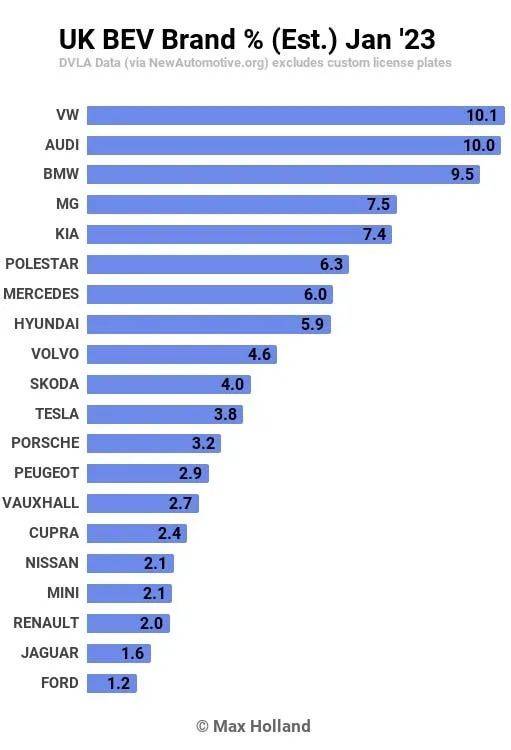 >>1月份,特斯拉正处于物流周期的低潮,因此大众汽车品牌有机会在英国BEV市场上占据领先地位。紧随其后的是集团兄弟品牌奥迪,宝马排名第三。> >