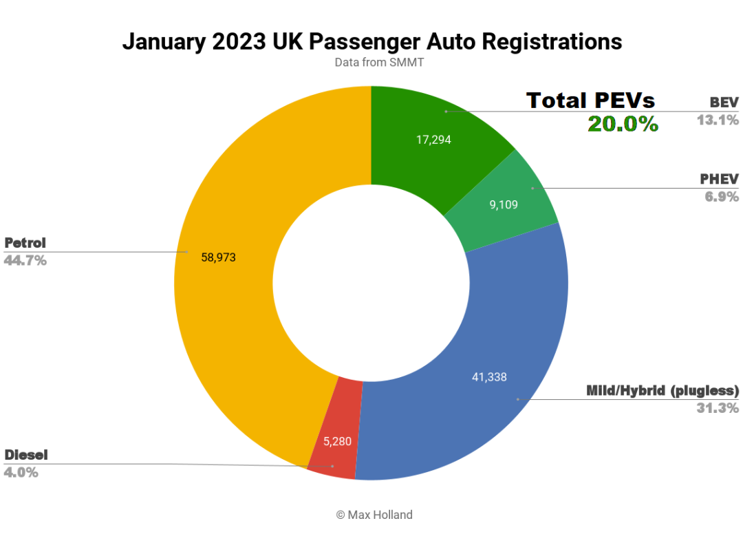 > >>英国1月份新能源汽车市场份额占整体汽车销量的20.0%,与去年同期的20.4%持平。纯电动汽车略有增长,而插电式混合动力车萎缩。汽车总销量为131,994辆,同比增长约15%,但仍比2020年之前的季节性标准低21%。大众汽车是英国1月份最畅销的BEV品牌。> >