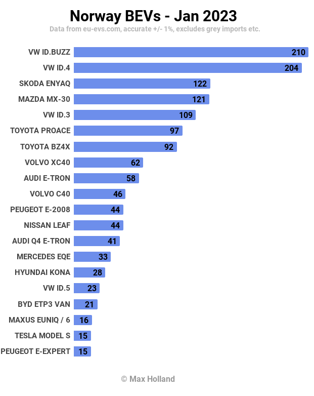 > >>挪威1月份新能源汽车占据了76.3%的汽车市场份额,低于去年同期的90.5%。由于新的一年,汽车排放收紧和税收增加,销量集中爆发于12月份,1月份的汽车市场非常反常。1月份的汽车总销量仅为1,860辆,不到12月销量的5%,是60多年来的最低月销量。未来几个月,汽车市场将恢复常态。1月份最畅销的是大众 ID.Buzz。> >