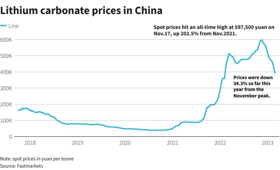 >目前,中国碳酸锂现货价格已从11月中旬的每吨近60万元跌至目前的40万元以下。多位来自中国的分析师与锂矿贸易商透露,到2023年底,这一价格极有可能跌破30万元,这是去年11月巅峰水平的一半左右。> >