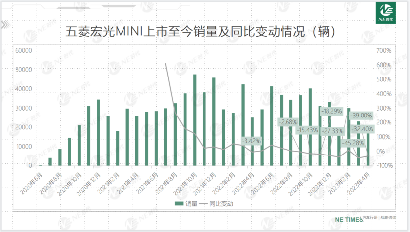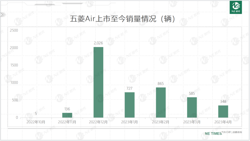 五菱Air因为续航的提升,整体售价高于宏光MINI,2023年4月销量仍然在百辆级别徘徊,7个月爬坡但是未在销量上迎来新的突破。> >